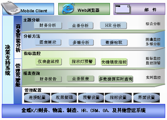 金蝶K/3決策支持管理解決方案是幫助企業(yè)決策的優(yōu)化工具和分析手段,通過優(yōu)化日常事務(wù)處理數(shù)據(jù),及時獲取企業(yè)實際運營數(shù)據(jù),提供準(zhǔn)確、及時、科學(xué)并且多視角、多維度的決策分析數(shù)據(jù),方便決策者及時了解企業(yè)各個環(huán)節(jié)的運行狀況,一目了然地得到企業(yè)關(guān)鍵績效目標(biāo)與實際經(jīng)營指標(biāo)的差異,及時發(fā)現(xiàn)企業(yè)經(jīng)營中的異常,及時做出準(zhǔn)確的決策,把握企業(yè)未來增長和盈利的機會。